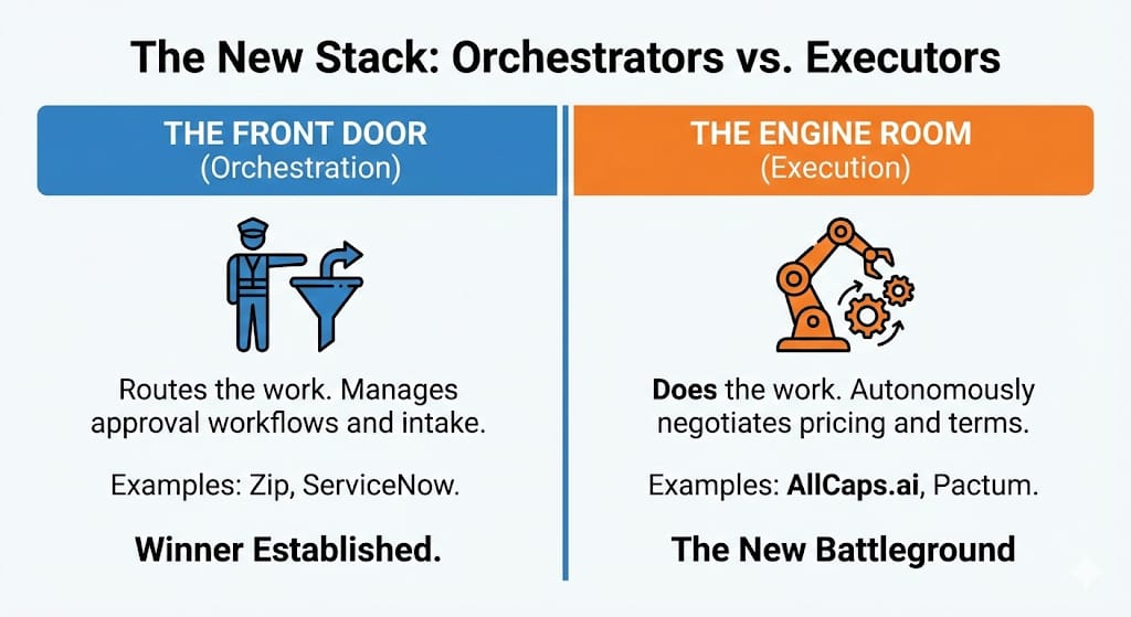 The Reality Check: The new stack has two layers. You need an Orchestrator (like Zip) to route the work, and Executors (like AllCaps.ai or Pactum.ai ) to do the work. If your roadmap only focuses on "Intake," you are solving yesterday's problem.